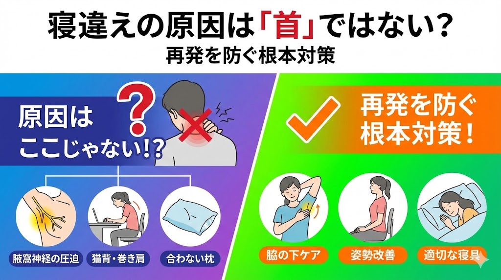 根本的な原因を知ることで、ただ痛みを逃がすだけでなく、寝違えにくい体づくりを目指していきましょう。