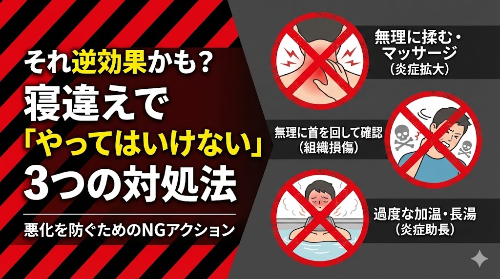 「痛いからとりあえず揉んでおこう」「お風呂で温めたら楽になるかな?」なんて思っていませんか?実は、寝違え直後の体に対して、良かれと思ってやったことが逆効果になるケースが少なくありません。