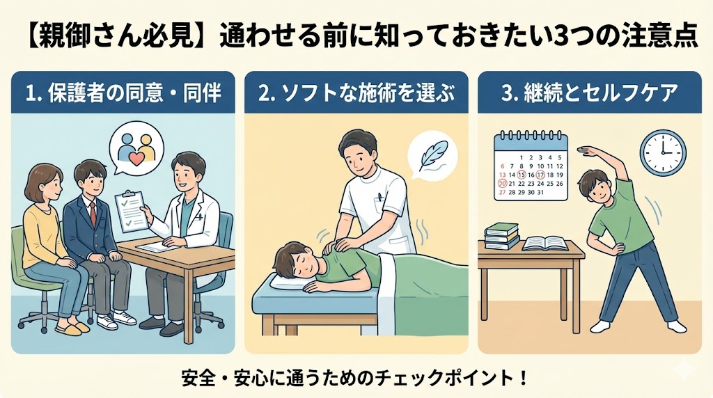 「うちの子にはまだ早い」と思わずに、まずは専門家に体の状態を触診してもらうことから始めてみてはいかがでしょうか。早めのケアが、受験勉強や部活に打ち込める健やかな体づくりを支えてくれるはずですよ。