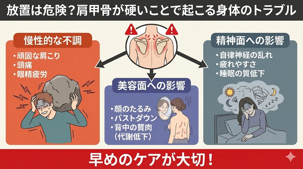まずは、真っ先に実感しやすいのが慢性的な不調ですよね。肩甲骨周りの筋肉が固まると血行が悪くなり、しつこい肩こりや、そこからくる頭痛、眼精疲労に悩まされるケースが多いようです。