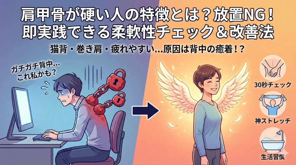 肩甲骨が硬い人の特徴を徹底解説。長時間のデスクワークや姿勢の乱れが原因で肩甲骨の可動域が狭まると、肩こりや代謝の低下を招きます。まずはあなたの柔軟性をセルフチェックしてみましょう。ガチガチの背中を解きほぐし、痩せ体質と疲れにくい体を手に入れるための簡単ストレッチも紹介します。