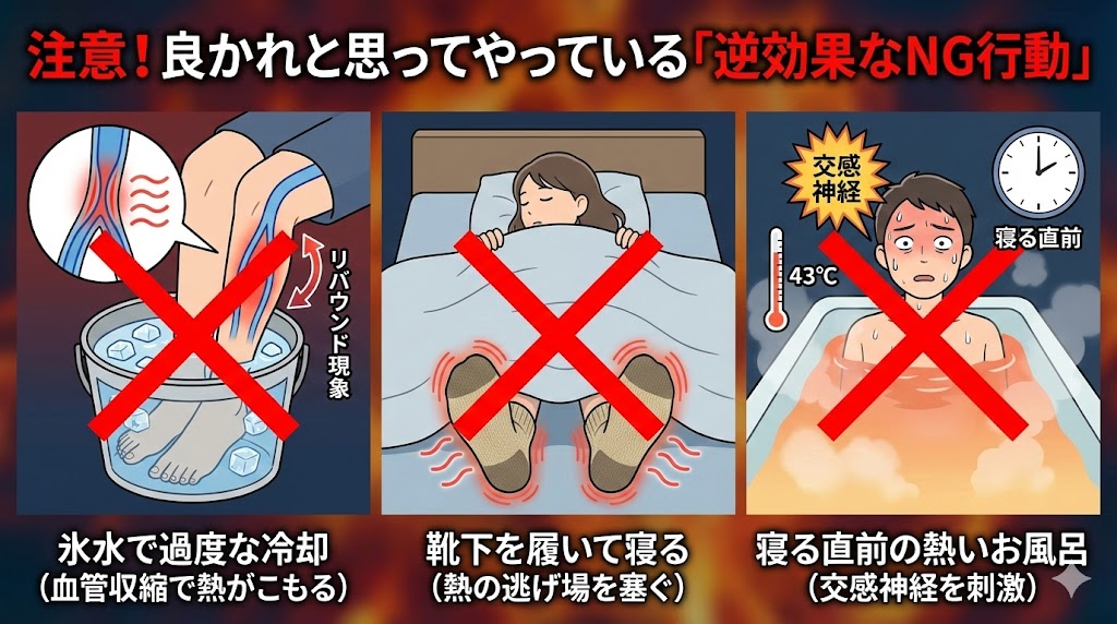 手足が熱くて眠れないとき、なんとかして冷やそうと必死になりますよね。でも、その努力が裏目に出てしまっているかもしれません。ここでは、ついやってしまいがちなNG行動についてお伝えします。