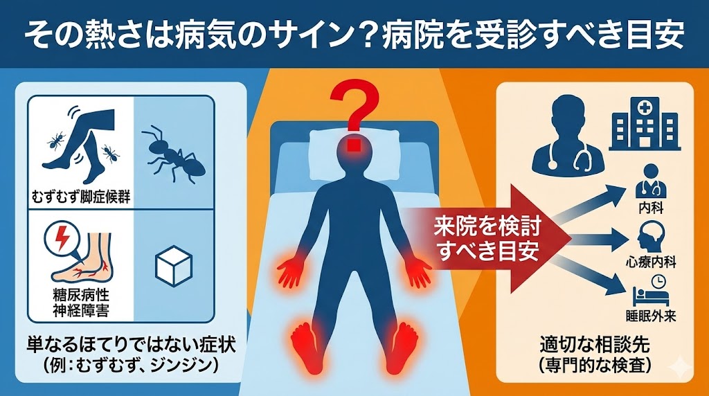 手足が熱くて眠れない対処法を探している方へ。夜中に手足がほてり寝付けない原因は、自律神経の乱れや「冷えのぼせ」かもしれません。この記事では、今すぐ熱さを和らげる正しいケアから、実は逆効果なNG行動、受診すべき病気のサインまで専門的な視点で解説します。