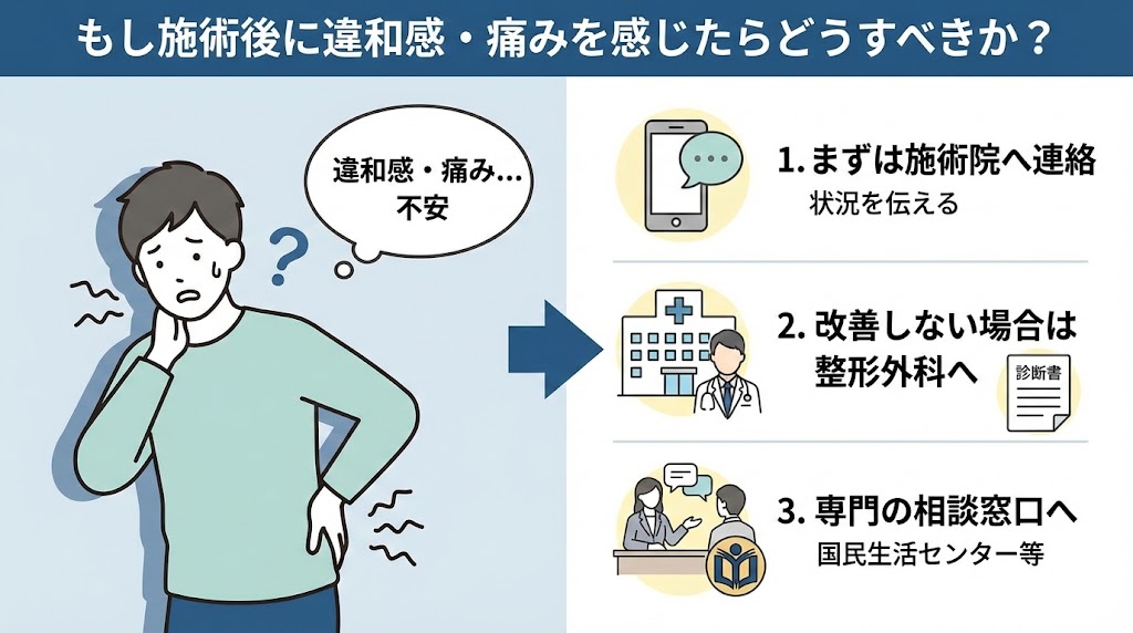 もし施術後に違和感が出た場合、どのようなステップを踏めば安心につながるのか、具体的な対処法を一緒に確認していきましょう。