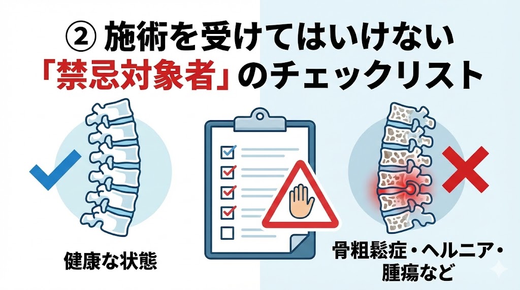 まず、骨や血管に不安がある方は特に慎重になる必要があると言われています。たとえば、骨粗鬆症の方は骨がもろくなっているため、通常の施術でも骨折のリスクが高まると指摘されています。また、脊柱管狭窄症や椎間板ヘルニアを抱えている場合、無理な刺激が神経を圧迫し、しびれや痛みが悪化する恐れがあるようです。