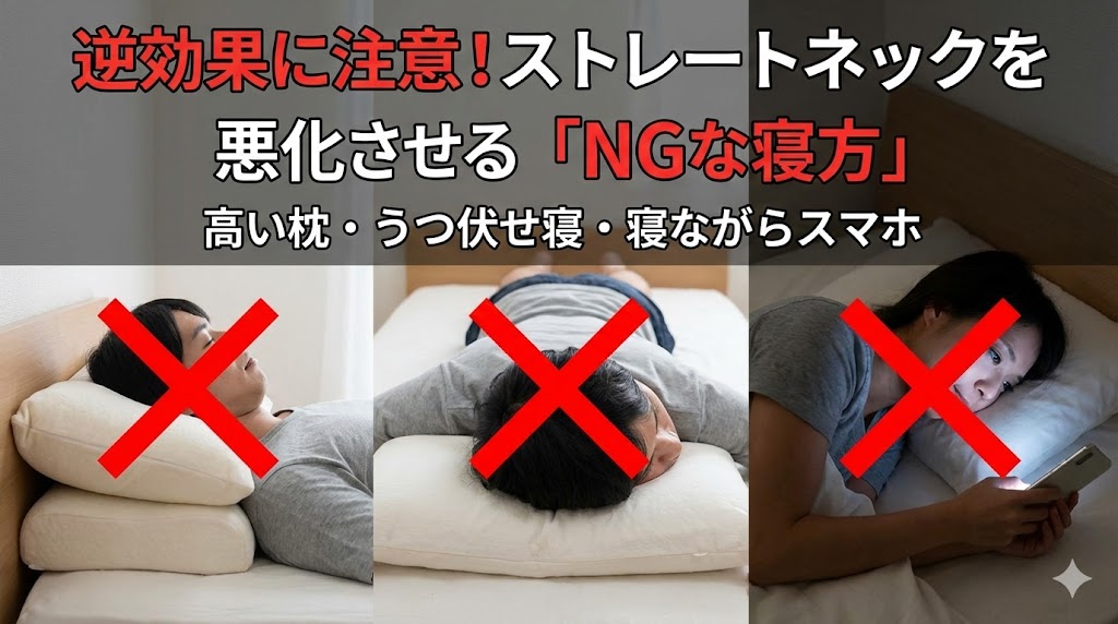 この状態を長時間続けると、首の関節や筋肉に不自然なねじれの負荷がかかり続け、ストレートネックの改善を妨げる可能性があると考えられています。できるだけ仰向け、あるいは横向きで、首を自然な角度に保てる寝姿勢を心がけたいところですね。