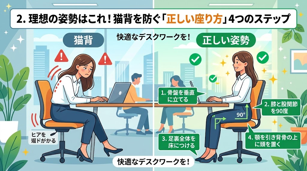 2.理想の姿勢はこれ!猫背を防ぐ「正しい座り方」4つのステップ