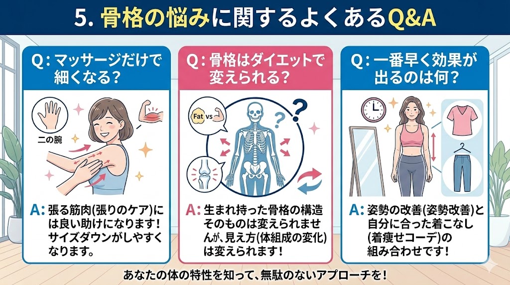 二の腕や太もものラインについて調べていくと、「結局、骨格がすべてなの?」「努力しても無駄なのかな……」と不安になることもありますよね。ここでは、読者の皆さんが抱きがちなリアルな疑問について、一つずつ丁寧に答えていきます。