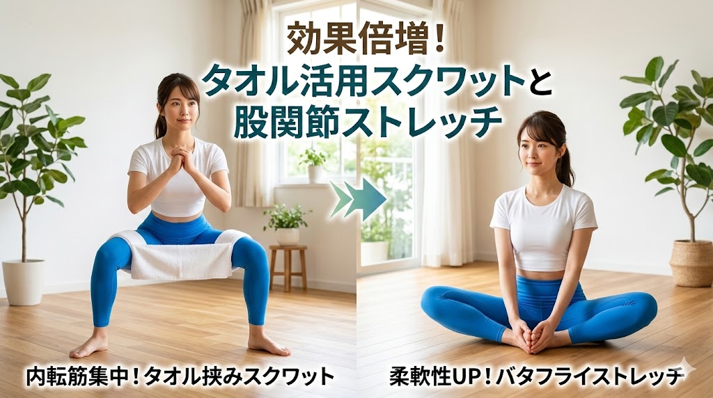 4.効果を倍増させる!タオルを使った「内転筋集中スクワット」とストレッチ
