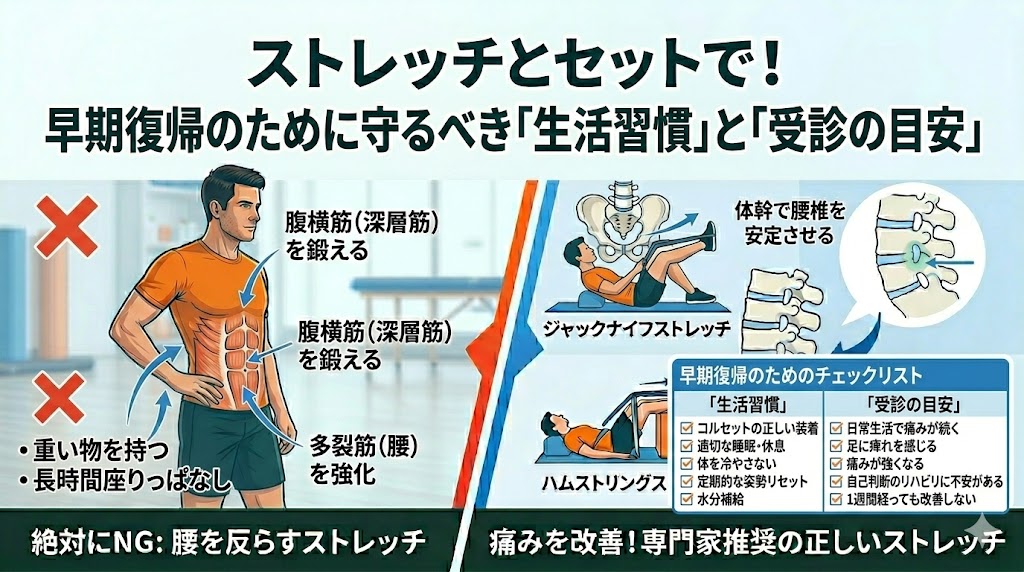 ストレッチや体幹トレーニングと並行して、日々の過ごし方を見直すことも早期改善には欠かせません。「いつになったら全力で動けるの?」という不安を抱えている方も多いと思いますが、焦らず一歩ずつ進んでいきましょう。