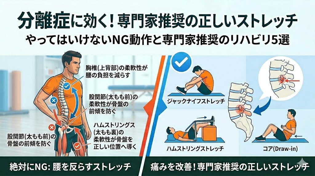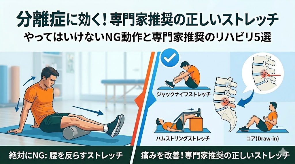 分離症(腰椎分離症)のストレッチには「やっていいもの」と「絶対ダメなもの」があります。本記事では、腰への負担を減らし復帰を早めるための正しいストレッチ法を理学療法士の視点で解説。痛みを悪化させないための注意点も網羅しています。