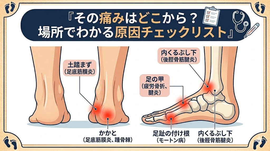 ご自身の足のどこが痛むのか、まずはそっと触れながら確認してみてください。痛みの「地図」をたどることで、今の足の状態が少しずつ見えてくるかもしれません。