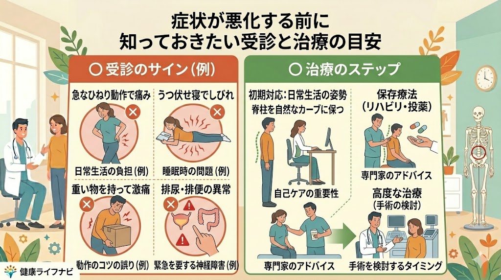特に注意していただきたいのが、**「排尿・排便障害」**が現れたケースです。「おしっこが出にくい」「便意がわからなくなった」「お尻の周りがしびれて感覚がない」といった症状は、神経が強く圧迫されている非常に緊急性の高いサインだと言われています。この場合は、一刻も早く専門の医療機関へ足を運ぶ必要があると考えられています。
