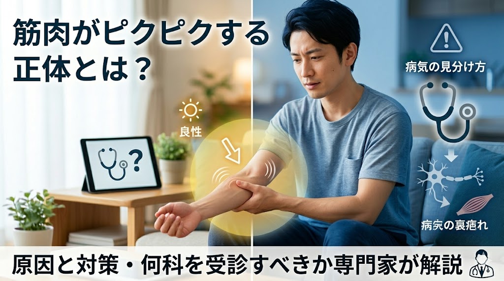 筋肉がピクピクする原因を徹底解説。疲労やストレスによる一時的なものから、注意が必要な病気のサインまで、症状別のチェックリストを掲載しています。病院は何科を受診すべきか、自宅でできる対策と合わせて専門的な視点でお届けします。