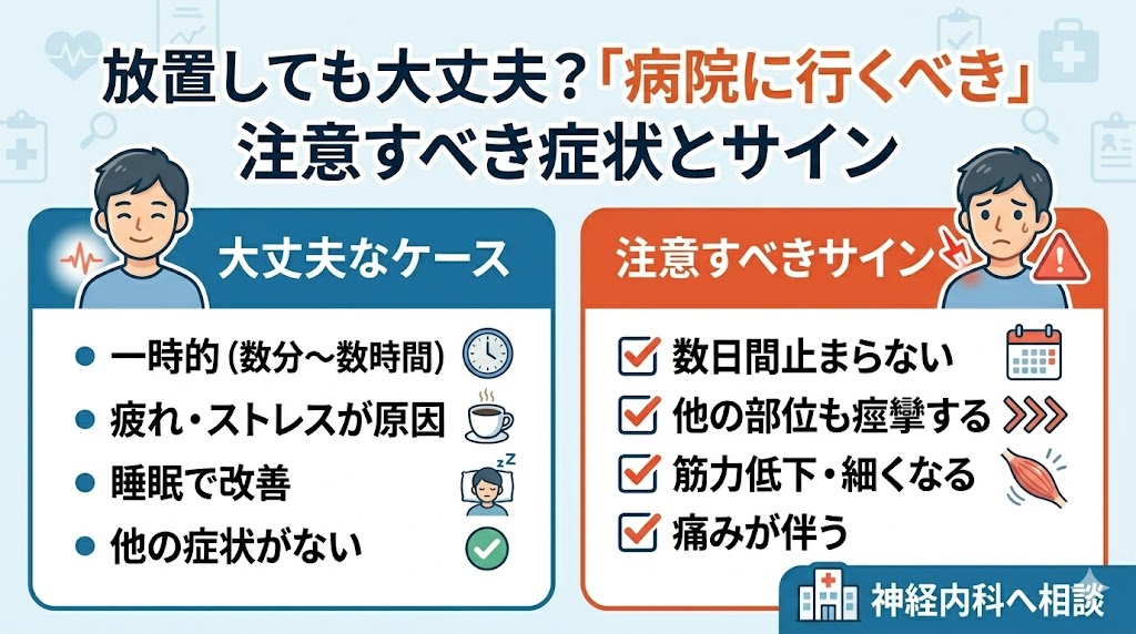 もしも筋肉が痩せてきたように感じたり、力が入らなくなったりといった変化がある場合は、早めの相談がおすすめだと言われています。専門家に「大丈夫ですよ」と言ってもらえるだけで、ストレスが軽減し、ピクピクが収まっていくケースも少なくありません。