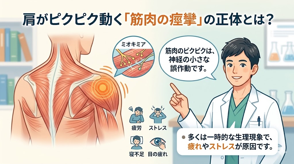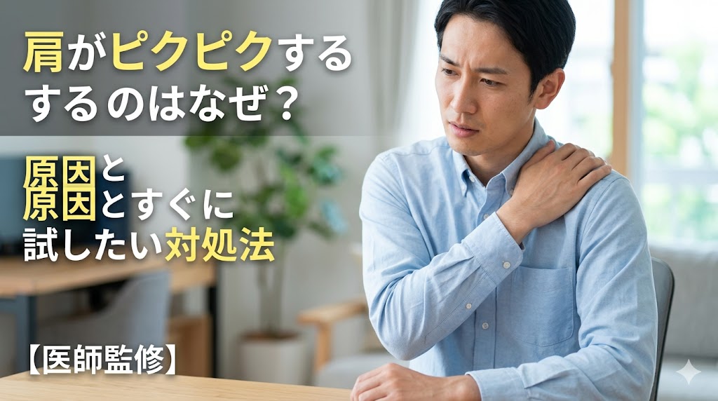 肩がピクピクする症状にお悩みの方へ。この筋肉の痙攣(けいれん)は、ストレスや疲れ、眼精疲労が主な原因であることが多いですが、稀に病気のサインであることも。本記事では、肩が波打つように動く原因から、自宅でできる解消法、病院を受診すべき目安まで専門的な視点で分かりやすく解説します。