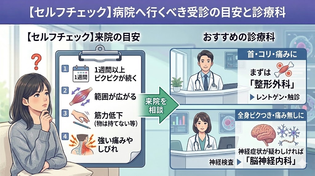 「ただの疲れかな?」と思いつつも、ピクピクが止まらないと「いつまで様子を見ていいんだろう」と悩みますよね。ここでは、自分でできるチェックポイントと、もし病院へ行くなら何科を選べばいいのか、具体的な基準をまとめてみました。