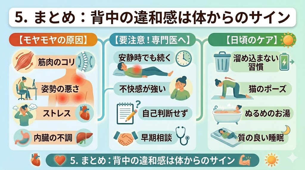 ここまで、背中のモヤモヤとした違和感について詳しくお話ししてきました。最後に、大切なポイントをもう一度おさらいしておきましょう。ご自身の体と向き合うためのヒントとして、ぜひ役立ててくださいね。