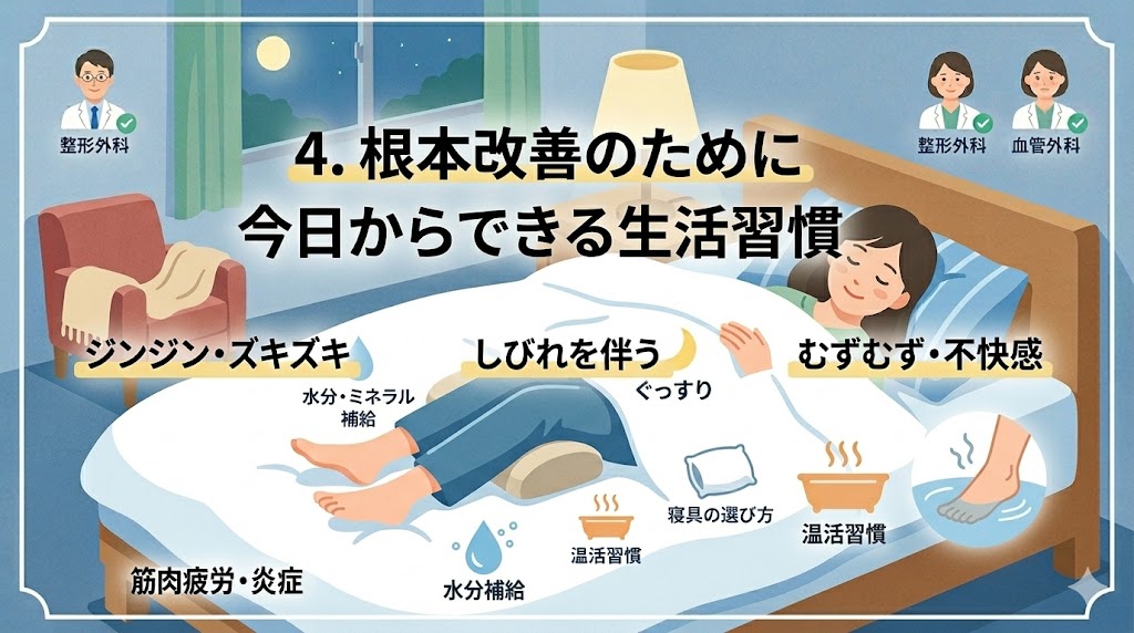 「夜中に足が痛くて目が覚めるのはもう嫌だ……」と切実に感じているなら、その場しのぎではなく、日々の習慣から見直してみませんか?
