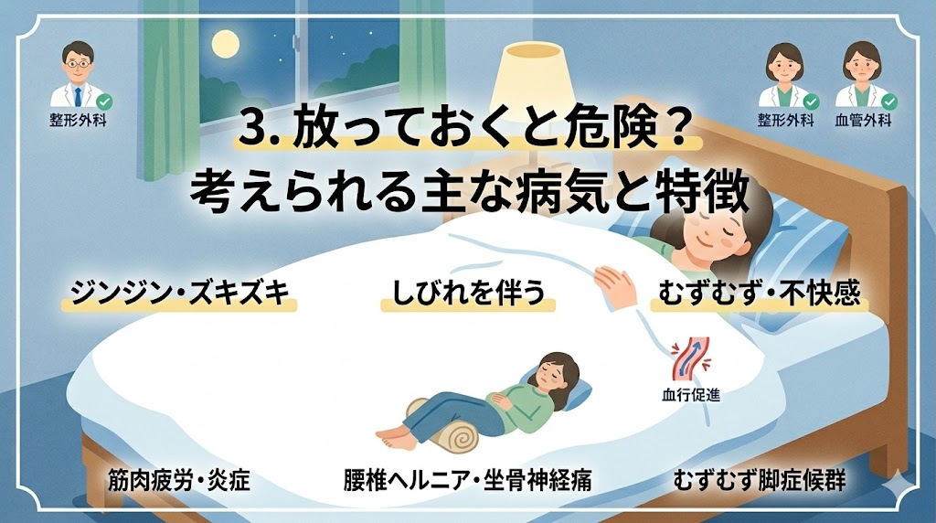 #坐骨神経痛 #下肢静脈瘤 #閉塞性動脈硬化症 #むずむず脚症候群#夜間の足の痛み