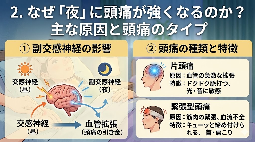 2. なぜ「夜」に頭痛が強くなるのか?主な原因と頭痛のタイプ