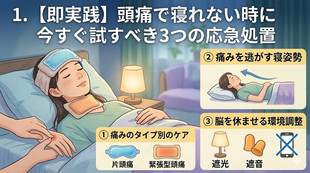 「ズキズキして眠れない…」「頭が重くて横になるのも辛い」と感じる時、まずは無理に寝ようとせず、以下の3つのアクションを試してみてください。