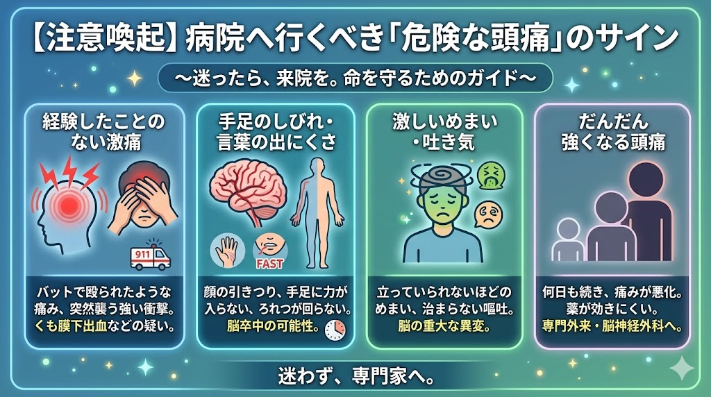 「いつもの頭痛だから大丈夫」と我慢しすぎてはいませんか?頭痛の中には、命に関わる重大な病気が隠れているサインも存在すると言われています。ご自身の体の声を無視せず、適切な判断基準を知っておくことが、あなたの大切な体を守ることにつながるでしょう。