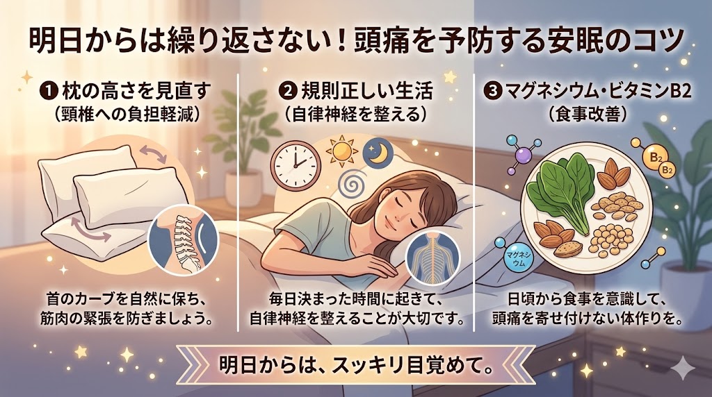 #頭痛予防 #安眠 #枕の高さ #規則正しい生活 #食事改善