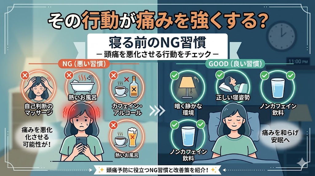 頭痛で眠れない夜、今すぐ実践できる対処法や痛みを和らげるコツを解説します。なぜ夜になると頭痛がひどくなるのか、その原因(片頭痛・緊張型頭痛)や、冷やす・温めるの正しい判断基準、避けるべきNG行動まで網羅。安眠を取り戻すための具体的なガイドです。