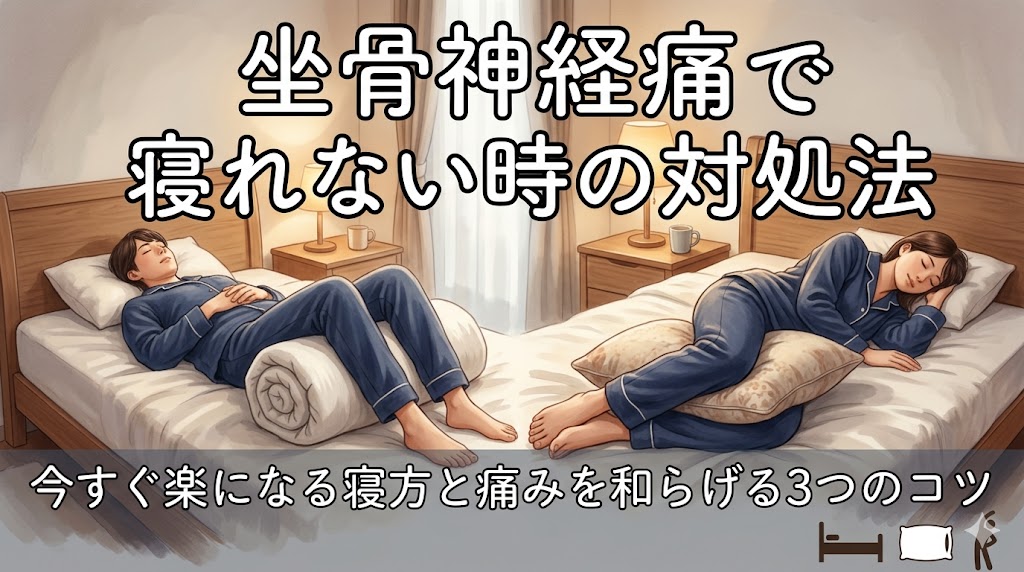 坐骨神経痛で寝れない時のために、今すぐ試せる「痛みが和らぐ寝姿勢」を専門家視点で解説します。なぜ夜に痛みが強くなるのかという原因から、クッションを活用した楽な姿勢、寝る前のストレッチまで紹介。今夜からぐっすり眠るための具体的なセルフケアを確認しましょう。