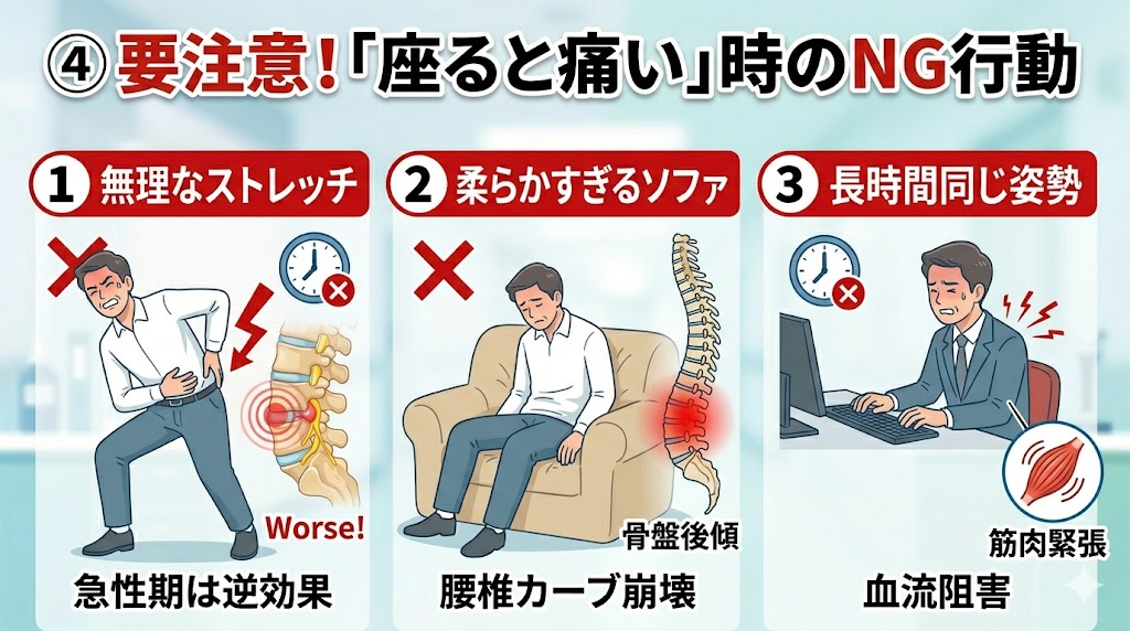 ④ 要注意!「座ると痛い」時にやってはいけない3つのNG行動