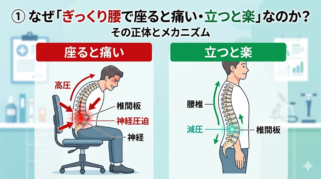 ① なぜ「ぎっくり腰で座ると痛い・立つと楽」なのか?その正体とメカニズム