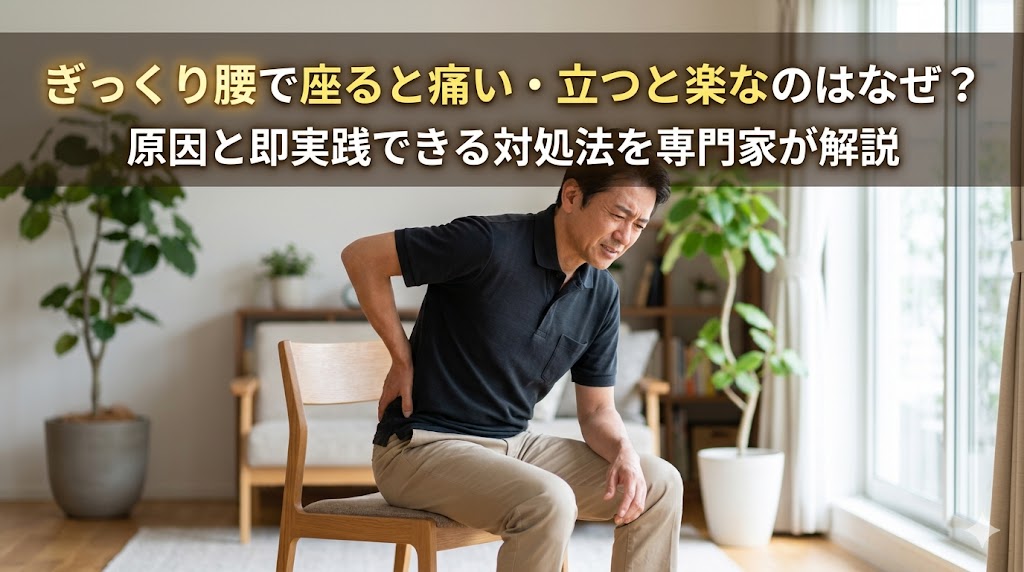 ぎっくり腰で座ると痛い・立つと楽という症状に悩んでいませんか?実は座り姿勢は立っている時より腰への負担が約1.4倍増えます。この記事では、痛みの原因となる筋肉や椎間板のメカニズム、痛みを和らげる座り方、やってはいけないNG行動をわかりやすく解説します。