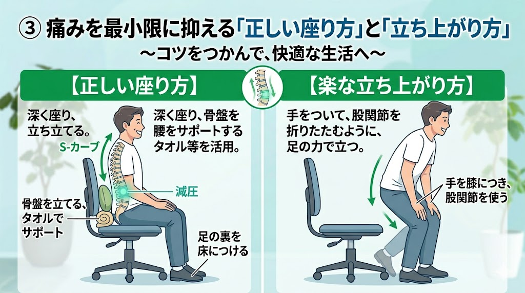 ③ 痛みを最小限に抑える「正しい座り方」と「立ち上がり方」