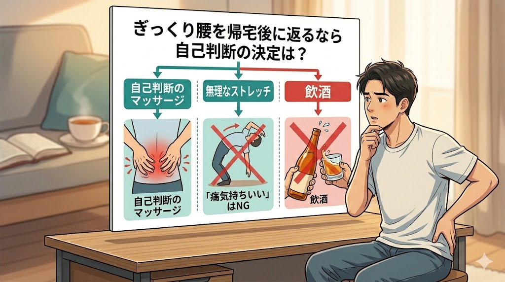 #ぎっくり腰のNG行動 #自己流マッサージは危険 #飲酒と腰痛の関係 #無理なストレッチ厳禁 #炎症悪化の防止