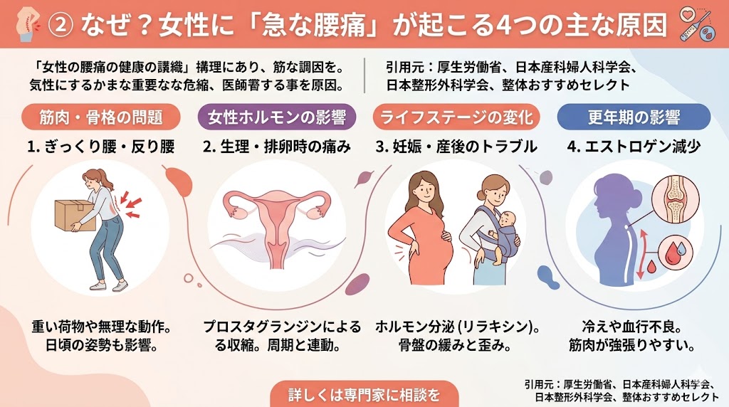 引用元:更年期障害の症状 – 日本産科婦人科学会 引用元:女性特有の腰痛原因 – 整体おすすめセレクト
