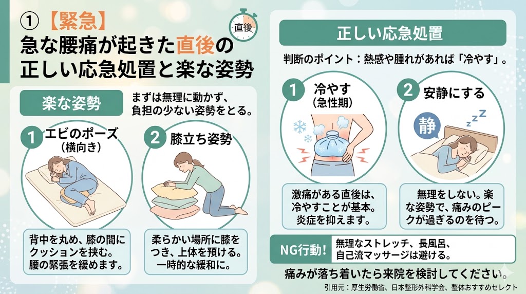 ① 【緊急】急な腰痛が起きた直後の正しい応急処置と楽な姿勢