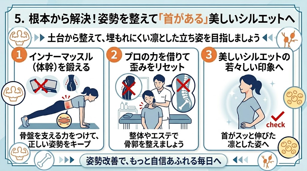 体幹がしっかり機能すると、無理に力を入れなくても骨盤がスッと立ち、首が肩の上に正しく乗るようになると考えられています。ヨガやピラティスのような、深い呼吸を伴う運動を取り入れるのがおすすめですよ。体の中から支える力がつくことで、埋もれにくい首のラインが定着しやすくなると言われています。