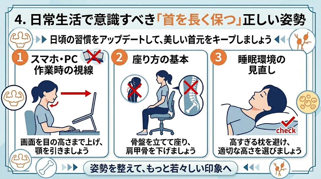 #首を長く見せる #正しい座り方 #スマホ首対策 #枕の高さ #姿勢の習慣化