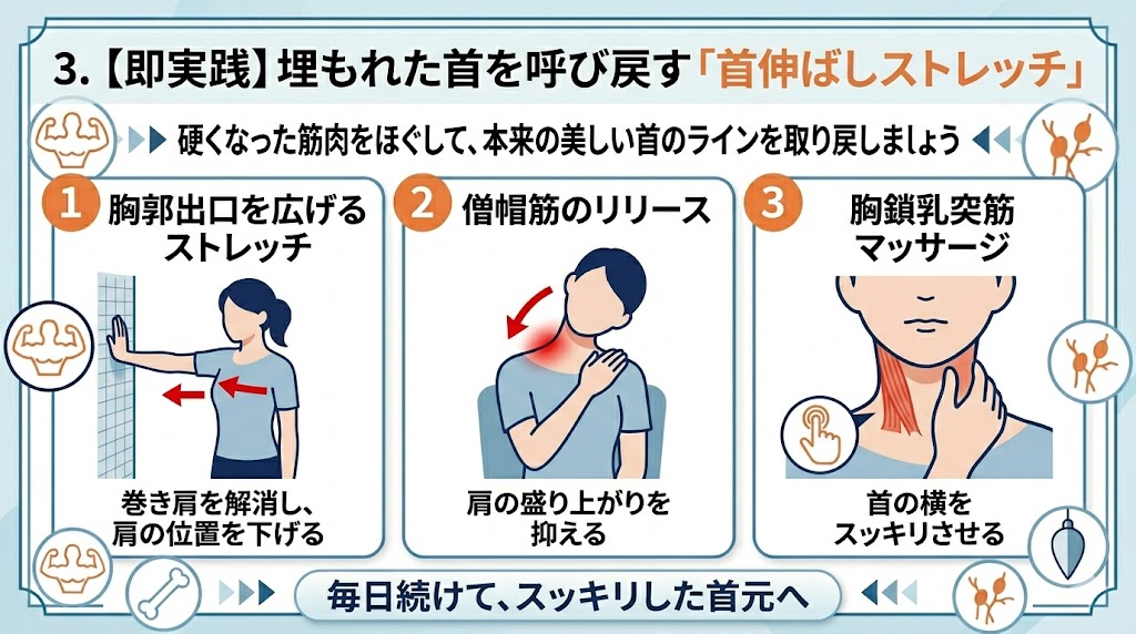 ③ 【実践】埋もれた首を呼び戻す!即効性を期待できるストレッチ5選