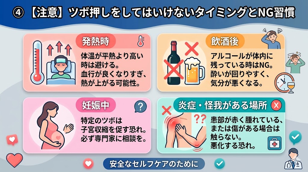 #ツボ押しの注意点 #セルフケアの安全性 #飲酒後はNG #妊娠中のセルフケア #健康管理