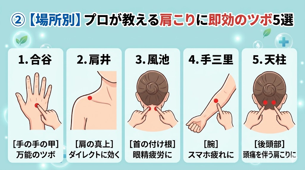 ② 【場所別】プロが教える肩こりに即効のツボ5選
