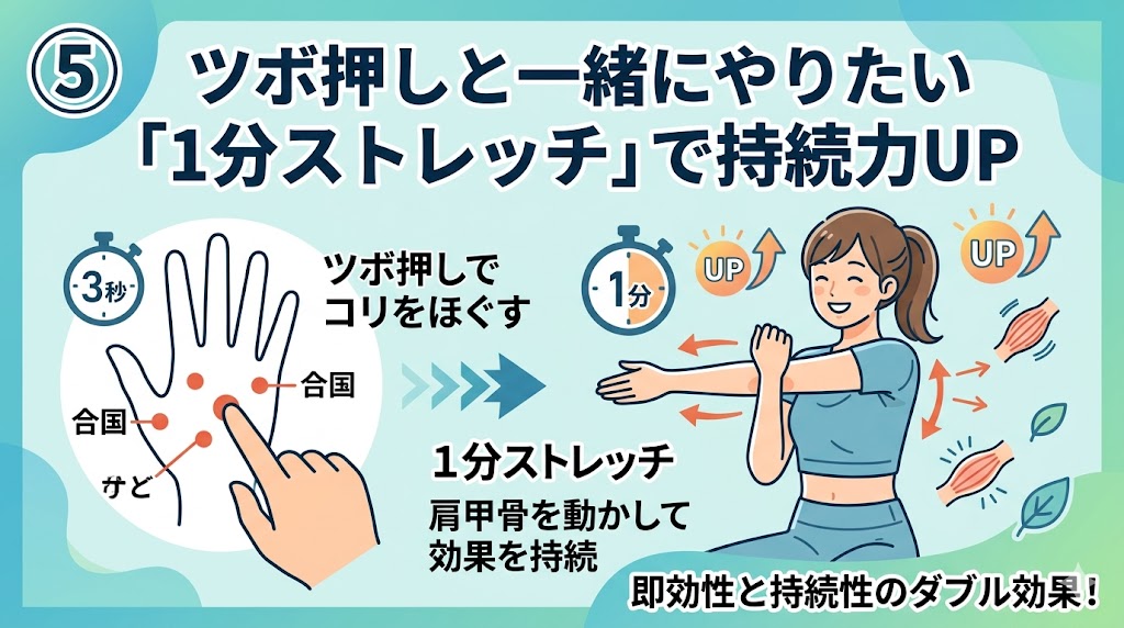 「ツボ押しで緩めて、ストレッチで流す」。この2ステップを習慣にすることで、ガチガチだった肩周りの環境が少しずつ良い方向へ向かっていくと言われています。ぜひ、今日からセットで試してみてくださいね。