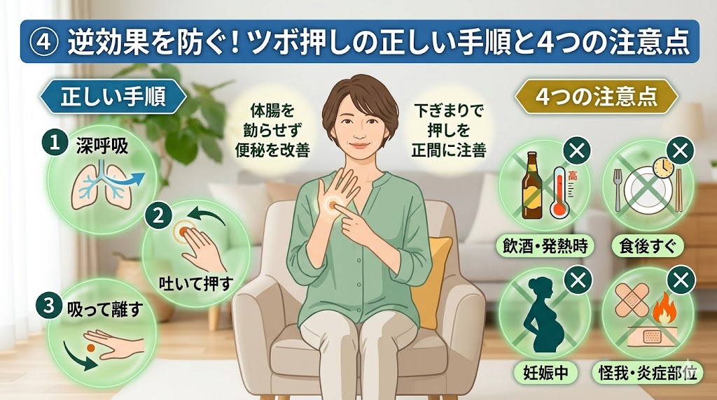 ④ 逆効果を防ぐ!ツボ押しの正しい手順と4つの注意点
