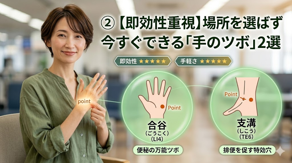 ツボを刺激して便秘を今すぐ解消したい方へ。手の「合谷」やお腹の「天枢」など、即効性が期待できるツボの場所と正しい押し方を詳しく紹介します。仕事中や寝る前に数分でできるセルフケアで、頑固な便秘をスッキリさせるコツをマスターしましょう。