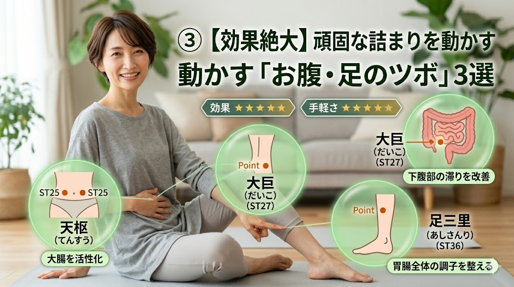③ 【効果絶大】頑固な詰まりを動かす「お腹・足のツボ」3選