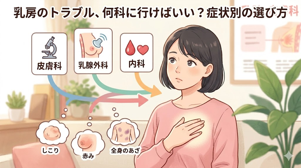 「病院へ行こう!」と決めても、いざとなると「何科のドアを叩けばいいんだろう?」と迷ってしまいますよね。胸というデリケートな場所だからこそ、適切な場所でスムーズに相談したいものです。