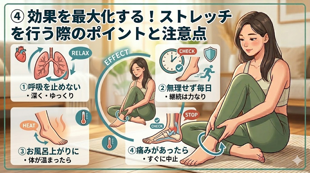 ④ 効果を最大化する!ストレッチを行う際のポイントと注意点