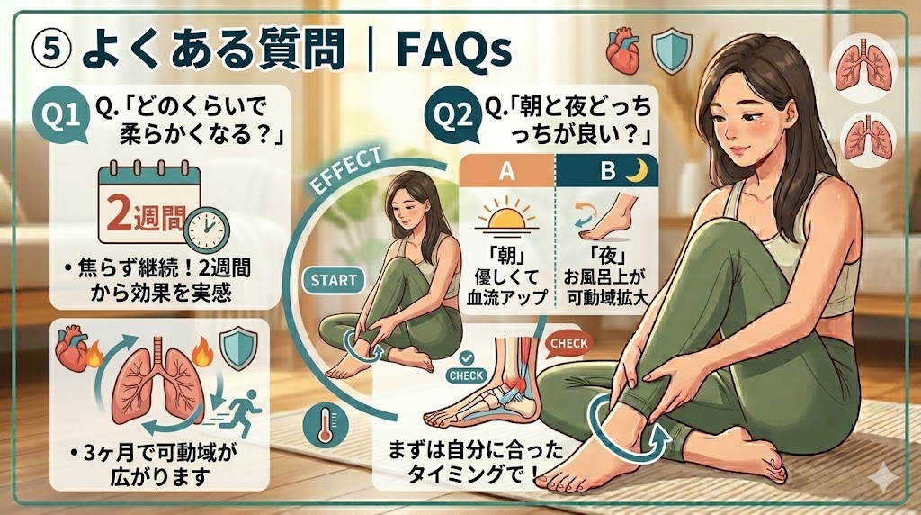 いざストレッチを始めようと思うと、「本当にこれでいいのかな?」「いつやれば効果が出やすいの?」といった細かい疑問が浮かんできますよね。ここでは、読者のみなさんからよくいただく質問について、Q&A形式でわかりやすくまとめてみました。