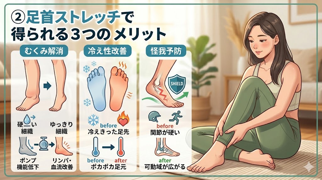 ② 足首ストレッチで得られる3つのメリット(むくみ・冷え・怪我予防)